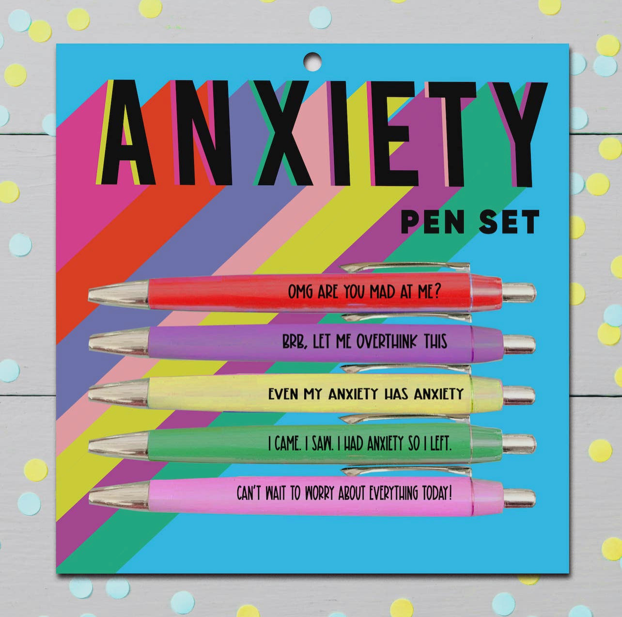 Introducing our Anxiety Pens—IYKYK 😅! Grand for those times when you want to say, "OMG, are you mad at me?" Just remember, if you ever feel overwhelmed, it's cool to take a break—'cause even your anxiety can get anxious! Perfect for sayin' "Gotta worry about everything today!" and these five black ballpoint pens are here to prove it.