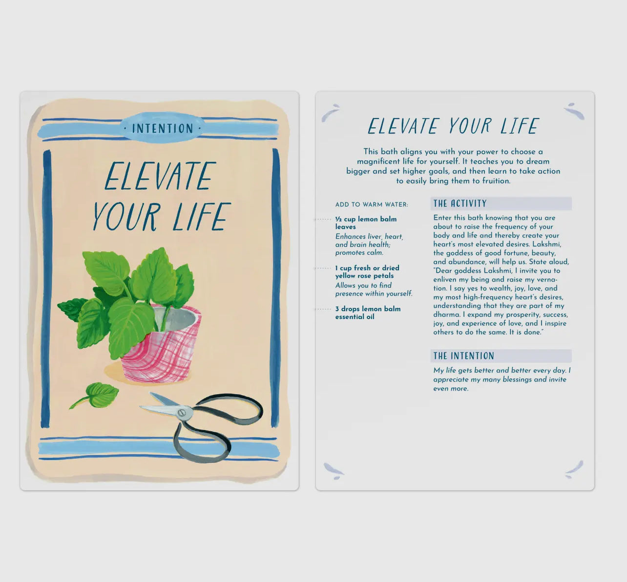 Transform your bath time into a blissful experience with our beautifully illustrated bath cards. Each card features a unique recipe for revival, relaxation, or creativity, as well as intentions, meditation, and contemplation. Say goodbye to a boring bath and hello to blissful baths!